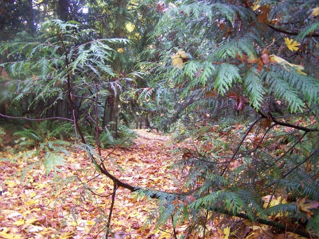 A cedar frond frames Autumn’s golden gown of maple leaves.