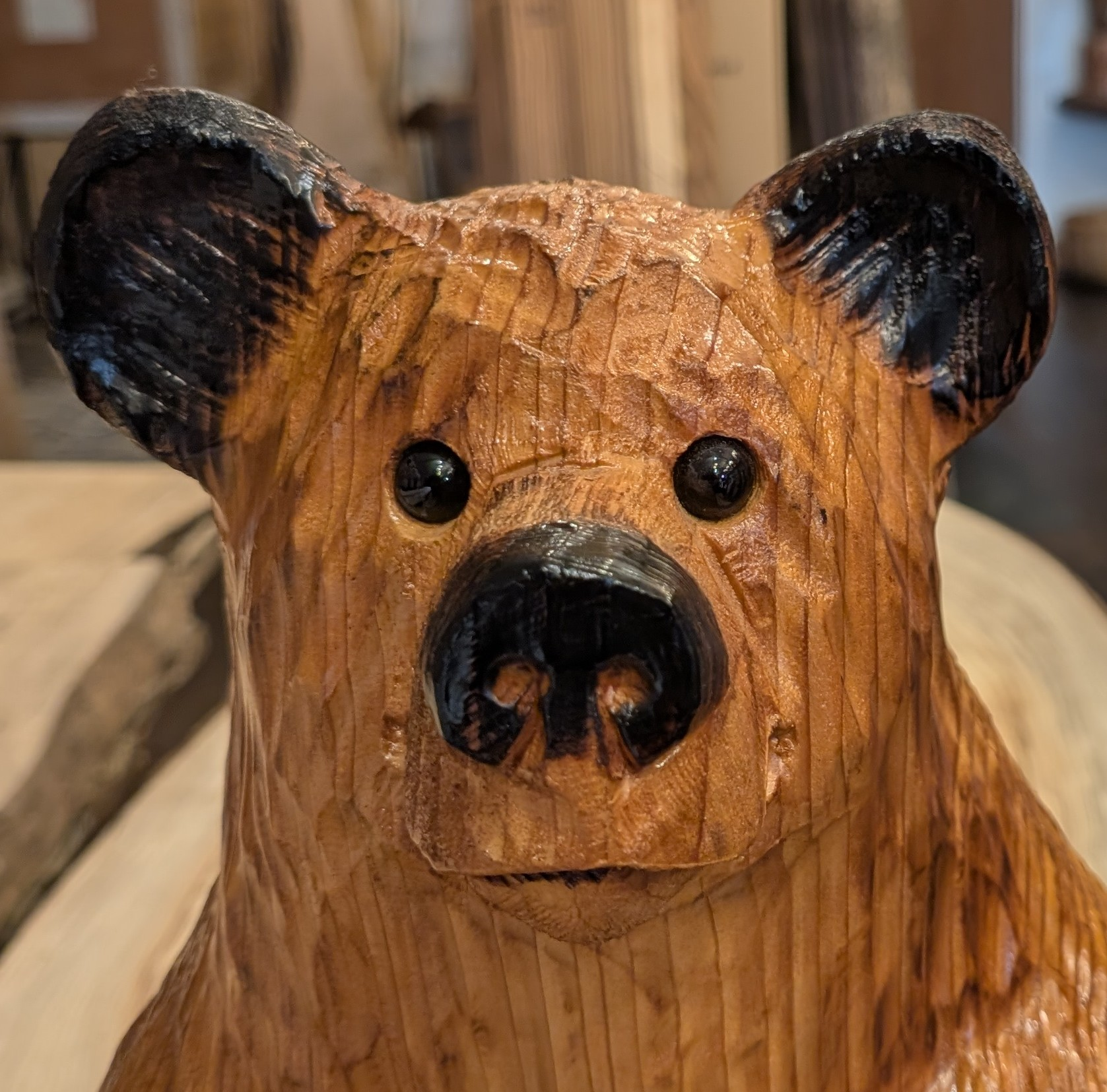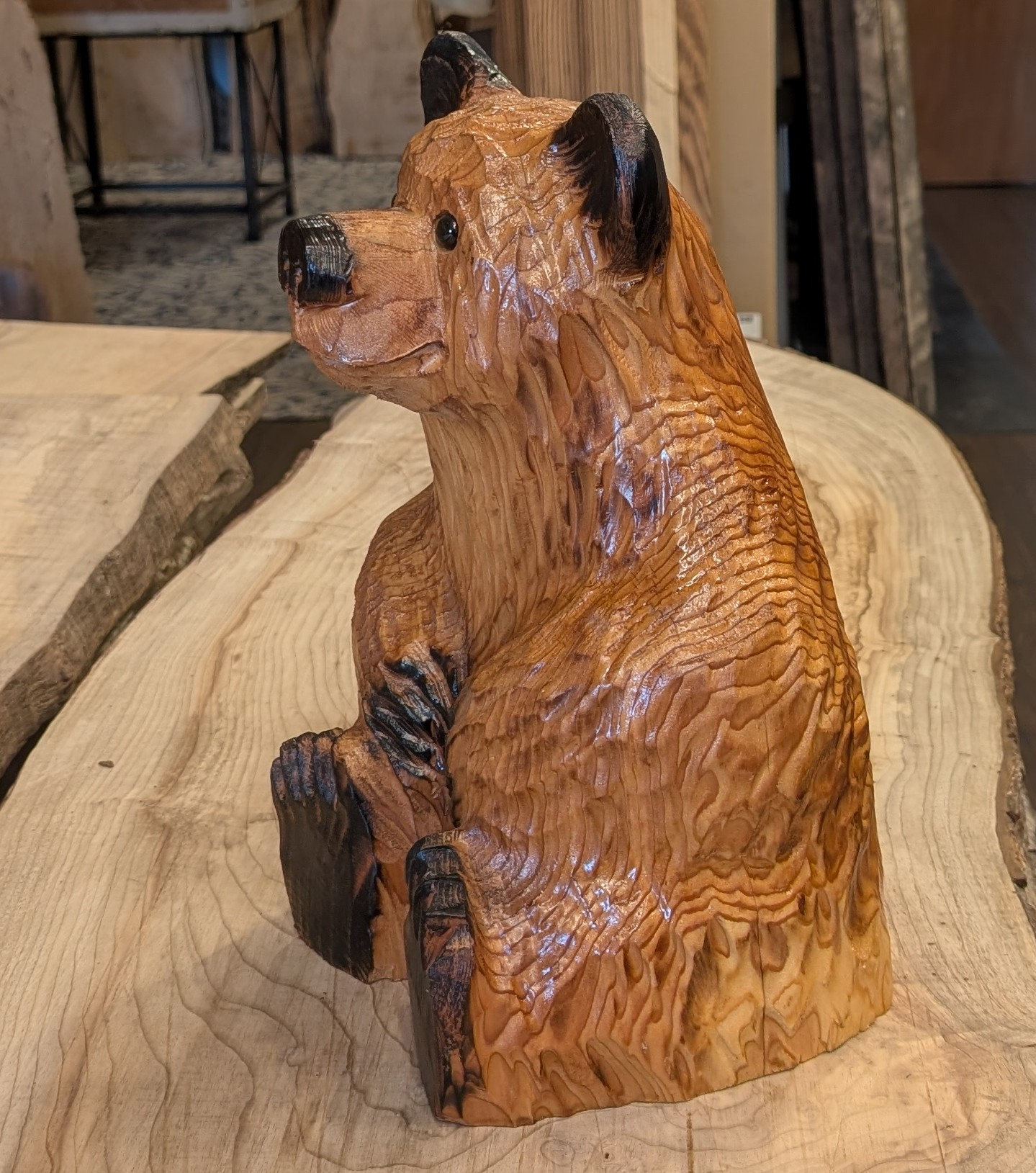 Chainsaw carved Medium Sitting Bear has a classic shape and a great expression. Handcrafted by an Oregon artist who learned from his Dad. Measures 15 x 9 x 8, $245.