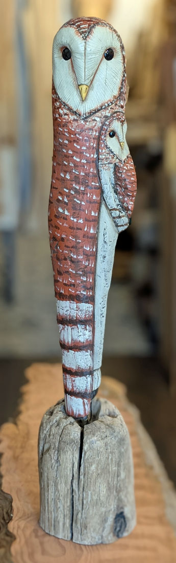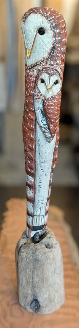 Meticulously handcrafted Driftwood Barn Owl and Baby, 29 x 6 x 5, has a unique vertical shape and is on a sturdy driftwood base. Super piece of driftwood and wonderful expressions on these faces. Priced at $295.
