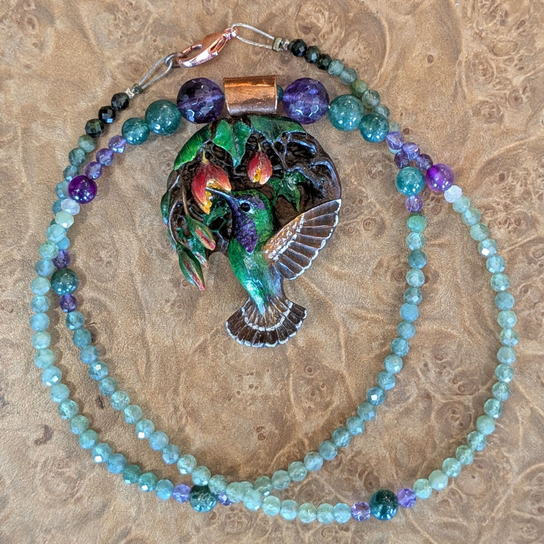Hand-carved Hummingbird necklace,1.25 x 1.75 x .5 inches, $275. Colorful bird and flower. Amethyst and Tourmaline beads. Necklace measures 18 inches.
