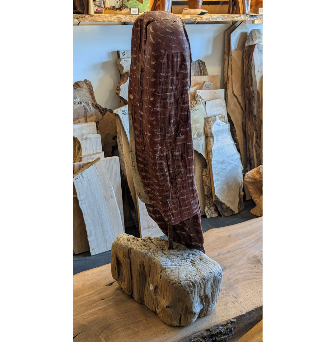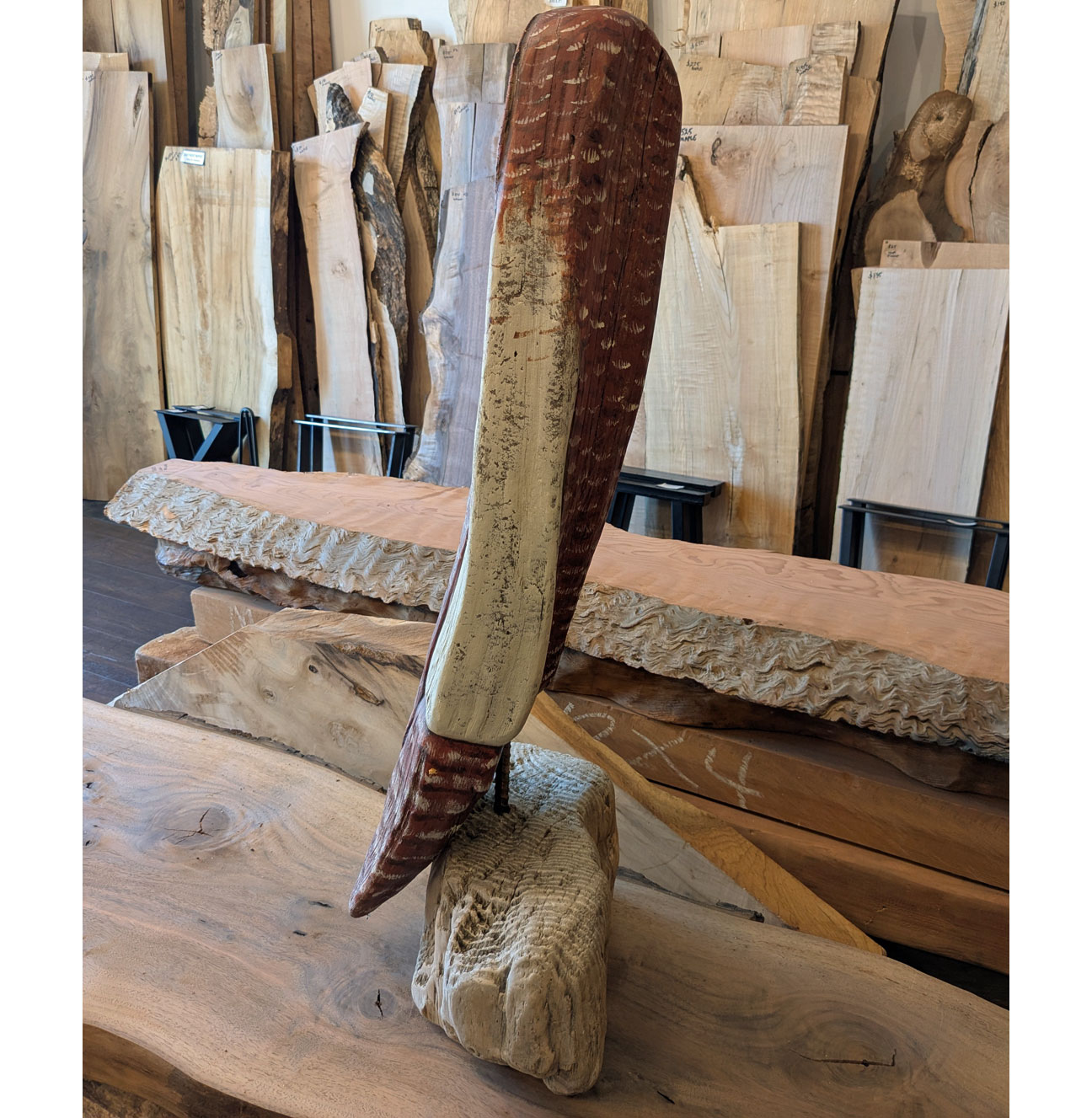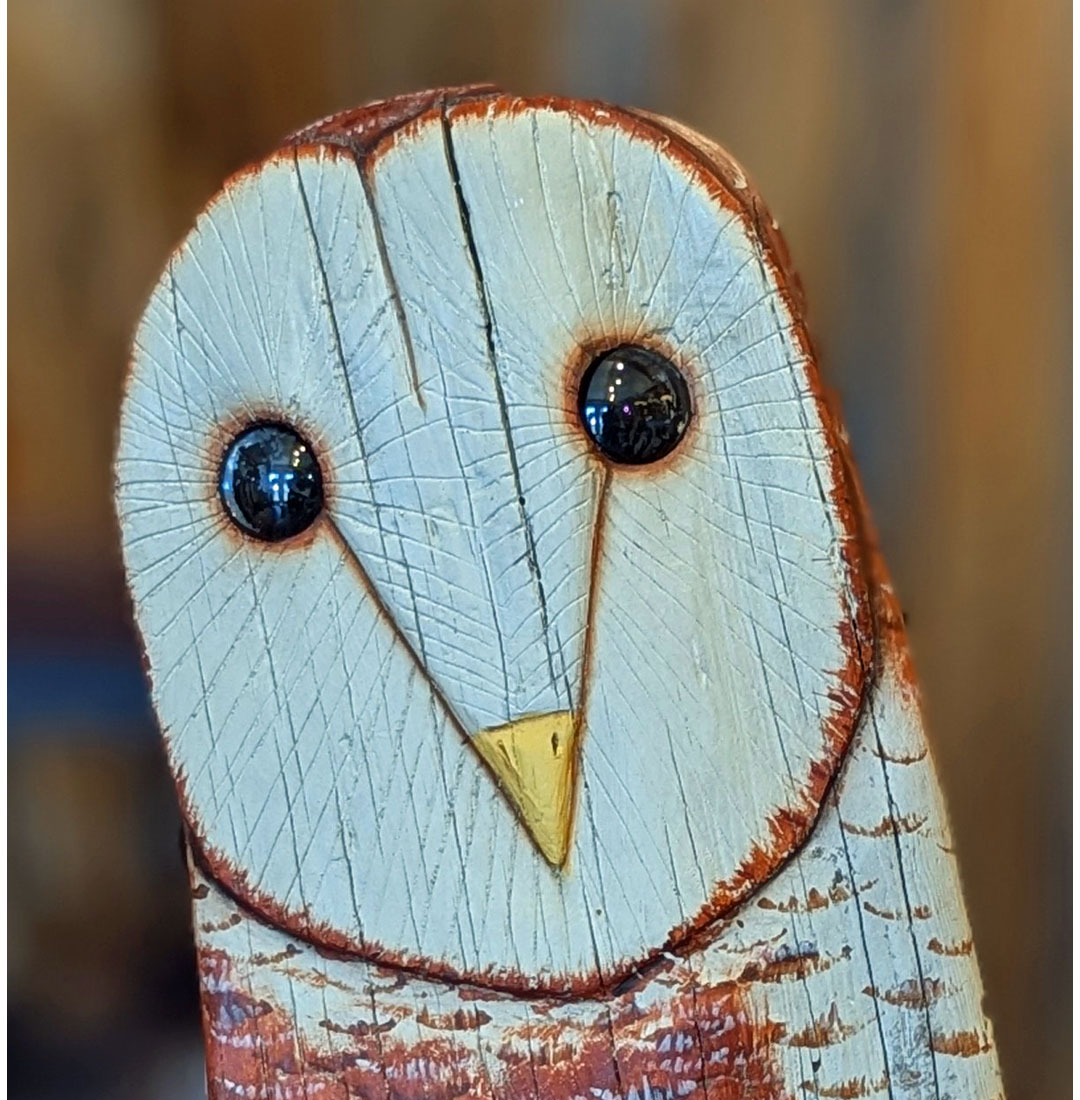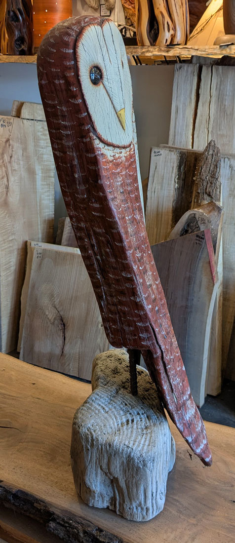 Handcrafted Large Driftwood Barn Owl on Stand, 31 x 12 x 10, has a lovely curve to it’s body and a beautiful face, $315. Separates from the base for easier shipping, in two pieces. Click through all the photos to appreciate the unique piece of wood.